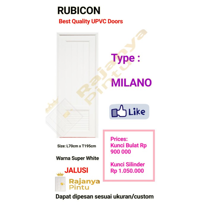 Berbekal dari pengalaman kami diindustri Pintu Non Kayu,dan dengan komitmen yang tinggi selalu memberikan yang terbaik kepada konsumen,maka kami hadirkan Pintu UPVC Rubicon dengan kualitas yg terjamin9 Alasan memilih Produk Pintu UPVC Rubicon1.Produk Berkualitas2.Harga Terjangkau3.Banyak Pilihan Model4.Elegant dan Modern5.Mudah Perawatan6.Mewah7.Tahan terhadap cuaca8.Warna Super white tidak mudah pudar9.Dikerjakan Tenaga Profesional dan Berpengalaman-Pintu UPVC Rubicon sangat cocok untuk ,ruang kantor,rumah,hotel,condominium dan apartement-Ready stock-Harga diatas adalah harga ukuran standart L70cm x T 195cm-Harga Sudah termasuk engsel stanlis 4",kunci,sekrup dan fisher-Dapat dipesan sesuai ukuran/custom-Dicari distributor seluruh IndonesiaPengiriman Gratis untuk wil JabodetabekUntuk konfirmasi pengiriman dapat menghubungi kami di WA RAJA : https://s.id/uktof**PENTING!!!Dikirim langsung oleh pihak toko diluar shopee ,(dari shopee hanya invoice atau faktur saja)Untuk keterangan lebih lanjut dapat menghubungi kamiRAJA : https://s.id/uktof#pintuupvc #pintukamarmandi #pintupvc #pintualmunium #tokomatrial #tokobangunan #tangerang #jakarta #bogor #bekasi #depok #rumahminimalis #rumahidaman #pinturumah #pintukaca #pintumewah #pintuminimalis #cintaprodukindonesia #baranglokal #kamarmandi #kantorminimalis #apartmentdesign #tokomatrial #pintutoilet #pintukantor #pintukamarmandimoni