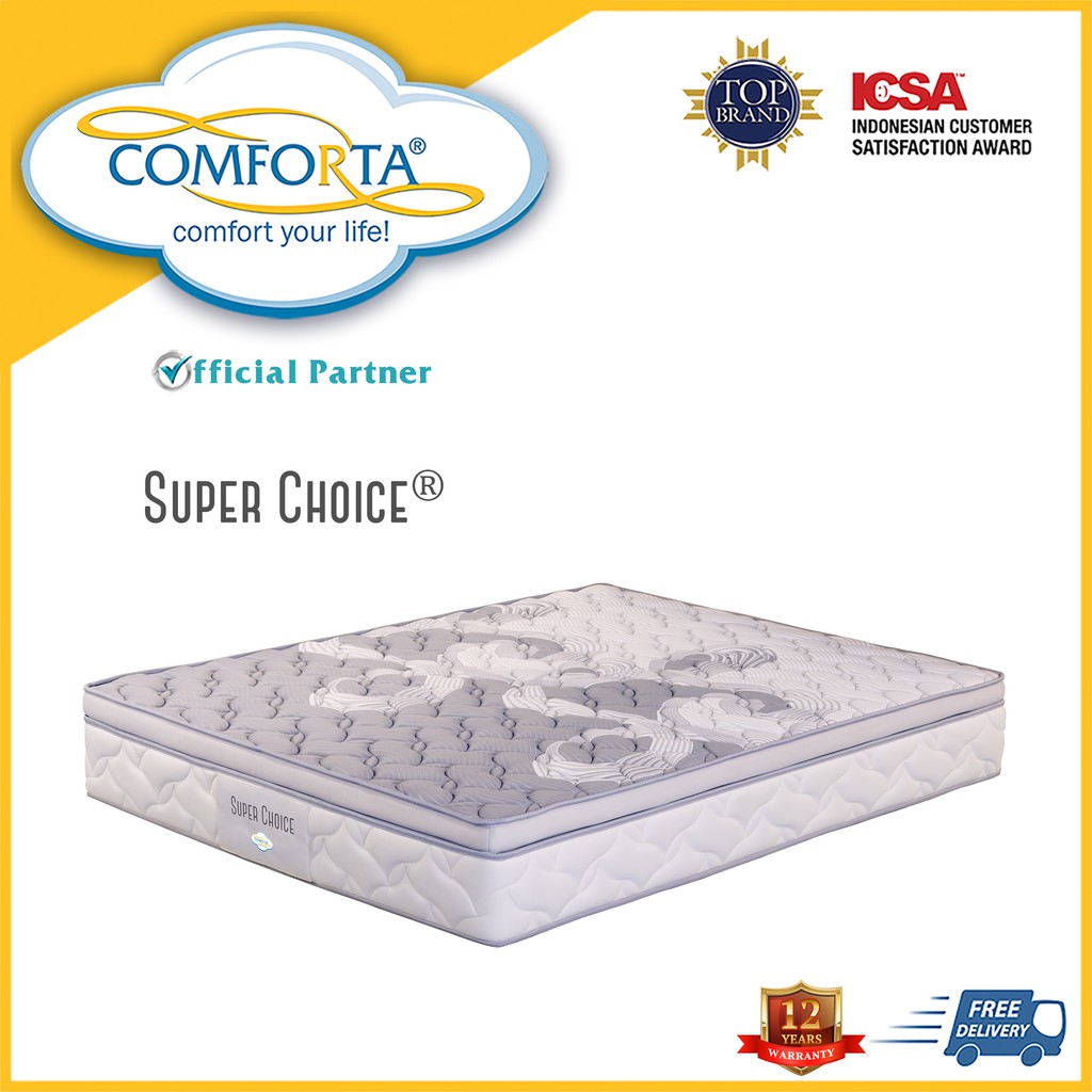 Produk Resmi dari Comforta Official Partner yang lebih terjamin dan terpercaya.Comforta Spring Bed adalah peraih 6x berturut-turut penghargaan INDONESIAN TOP BRAND sebagai merk paling paling top dan terpercaya pilihan konsumen Indonesia.Silakan chat ke Admin untuk konfirmasi produk atau ada yang ingin ditanyakan.Super Choice (Hanya Kasur)Spesifikasi Produk:* Tinggi Kasur : 29 cm* Feeling Kenyamanan : Medium / Sedang* Garansi Pegas : 12 tahun*Bonus(uk 90/100/120 -> 1 bantal )(uk 160/180/200 -> 2 bantal )Feature Produk :* Couple Comfort Springs* Euro Top* Hi-Thick Border Quilt* 3D Knitted Fabric* Double Guard (M-Guard, Corner Guard)* Steel Perimeter GuardFree Ongkir C