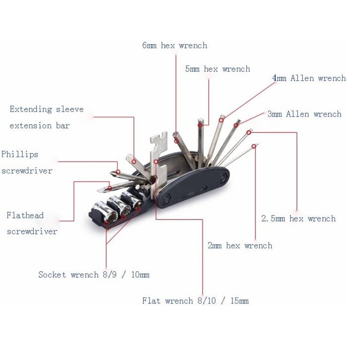 Peralatan multifungsi EDC (Every Day Carry) ini cocok untuk dibawa dalam kegiatan sehari-hari dan digunakan pada situasi yang dibutuhkan. Dilengkapi dengan berbagai macam peralatan reparasi yang praktis dan lengkap untuk dibawa.Dimension 9 x 2.6 cmDengan material Stainless membuat mini multi tool ini kokoh dan awet untuk digunakan. Memiliki kualitas yang sama dengan Victorinox Swiss Army Knife.Hadir berbagai macam peralatan yang sangat praktis untuk digunakan seperti:Obeng PhilipObeng MinusExtension BarFlat Wrench 8 / 10 / 15mmSocket Wrench 8 / 9 / 10mmHex Wrench 2 / 2.5 / 3 / 4 / 5 / 6 mmBentuk yang kecil dan dapat dilipat memudahkan Anda membawa multi tool ini. Semua peralatan yang Anda butuhkan tersedia dimanapun dan kapa