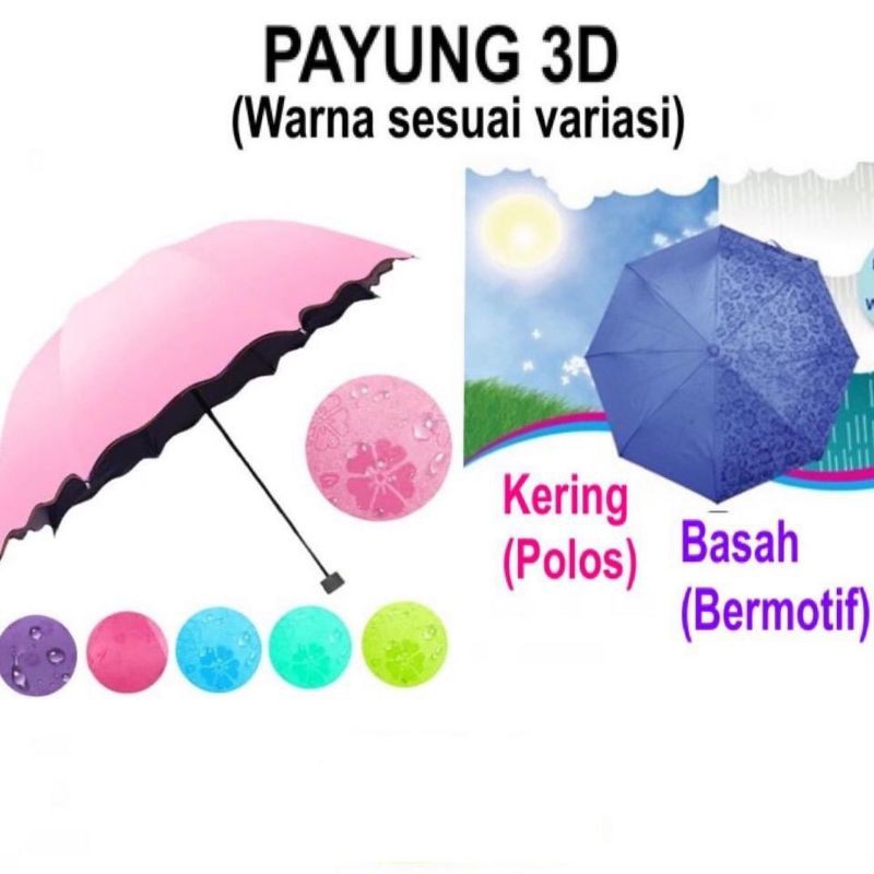 Payung Magic 3D / Payung AjaibPayung 3D Magic polos Berkualitas dilengkapi sarung & Lapisan Hitam Anti UV yang mempunyai motif kalau terkena airSangat cocok untuk segala kalangan- Lapisan Hitan Anti UV sinar matahari- Gagang kokoh tidak mudah patah- Tombol tutup&buka payung yang sangat nyaman (tidak akan melukai tangan karena sdh ada pelindung )- Sarung sesuai warna payung- Tiang anti karat- Fashionable ( tidak menurunkan gaya pakaianmu )Model lipat praktis ukuran besar / dewasaBisa untuk anak - dewasa.Ready Warna :- Pink- Hijau tua- Merah muda- Merah tua- Biru dongker- Biru tua / NavySpesifikasi :Bahan : Nilon Super lembutMotif : Bunga 3 DimensiLapisan : 1 layer dengan anti radiasi uv8 Jari - jariPanjang = 25 cm DilipatPanjang = 53.5 cm DibukaDiameter= 110 cm DibukaPERHATIAN :**SEMUA PRODUK HARUS DITANYAKAN TERLEBIH DAHULU BAIK STOCK MAUPUN JUMLAH BARANG YG AKAN DI BELI***********************[+] Welcome Reseller[+] Langsung di order aja ya kaka :)[+] Semua Ready Stock (TETAP HARUS KONFIRMASI)[+] Kunjungi toko kami dan cek barang-barang keren lainnya#payung #payunglipat #payung3d #payungmagic #payungajaib #payungpolos #payungmotif #payungmurah #payungteduh #payungpromosi #payungunik #payungsouvenir #payungcustom #payungsablon #payunganak #payungdewasa #payungbesar #jualpayung #jualpayungmurah #jualpayungunik #payunglucu #payungcantik #payungtransparan #payunglipatmurah #payungi