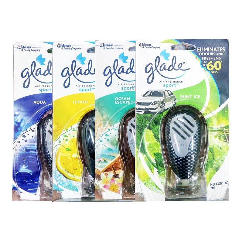 GLADE SPORT 7mlPengharum Mobil dengan parfum konsentrat, mampu mengharumkan mobil hingga 60 hari (untuk kondisi tertentu)Penampilan holdernya sporty dan dilengkapi dengan pengatur intensitas sehingga kekuatan parfum dapat disesuaikan dengan keinginan pemakai. Pemakaiannya dijepitkan di kisi-kisi AC mobil....stok ready mint i