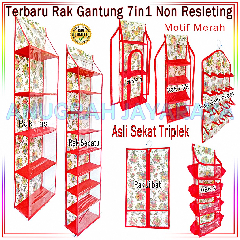PAKET HEMAT 7IN1 TANPA RESLETING VARIAN : 1.5IN1TANPA RESLETING = RAK TAS RAK SEPATU RAK JILBAB , RAK UNDERWEAR, RAK KOSMETIK SAKU, RAK KOSMETIK RESLETING, DAN RAK P3K. HARGA MURAH BERKUALITAS , BUKAN BARANG MURAHAN SILAKAN COMPLAIN JIKA TIDAK BAGUS DENGAN MIKA TEBAL ! SEKAT TRIPLEK TANPA RESLETING PILIHAN WARNA : MERAH, HIJAU, UNGU, PINK , BIRU DAN MOTIF SESUAI PERSEDIAAN STOCK.Kelebihan Set HJO + HBO + HSO + RAK UNDERWEAR:- Hijab/jilbab/kerudung, tas, sepatu anda akan tertata lebih rapi - Anda dapat menyimpan banyak hijab/jilbab/kerudung, tas, sepatu anda dalam satu tempat- Anda dapat menghemat tempat karena hijab/jilbab/kerudung, tas, sepatu, disimpan dalam tempat vertikal dan dapat digantung (meringkas rak/lemari biasa yang ukurannya relatif lebar dan ditaruhdilantai)- Hijab/jilbab/kerudung, tas, sepatu anda tidak mudah kotor karena HJO + HBO + HSO dilengkapi dengan cover- Hijab/jilbab/kerudung, tas, sepatu anda lebih mudah dicari karena cover HJO + HBO + HSO yangtransparan-Detail : 1 set terdiri dari 3 macam Barang ( WARNA dan MOTIF SERASI): -HJO :Gantungan Hanger Jilbab / Hijab / Kerudung- HBO (ukuran 138 x 40X19) : 5 tingkat, Gantungan Hanger Tas- HSO (ukuran 138x30X15) : 8 tingkat, Gantungan Hanger Sepatu- Bahan: Spondbound, mika, triplek(sekat 2mm)Berat satu set HJO + HBO + HSO+UNDERWEAR+HBK1+HBK2+RAK P3K tanpa resleting adalah 2100 gram (2kg JNE & JNT )Rak KOSMETIK Dimensi Rak 80x26x13cmUkuran Tiap Susun 26x12x13cmSisi Kanan ada 4 Kantong dan Sisi Kiri ada 4 KantongSekat TriplekBahan Kain SponboundBerat 160grMotif sesuai persediaan Warna antara HJO + HBO + HSO+UNDERWEAR+HBK1+HBK2+RAK P3K selalu samaORDER=S
